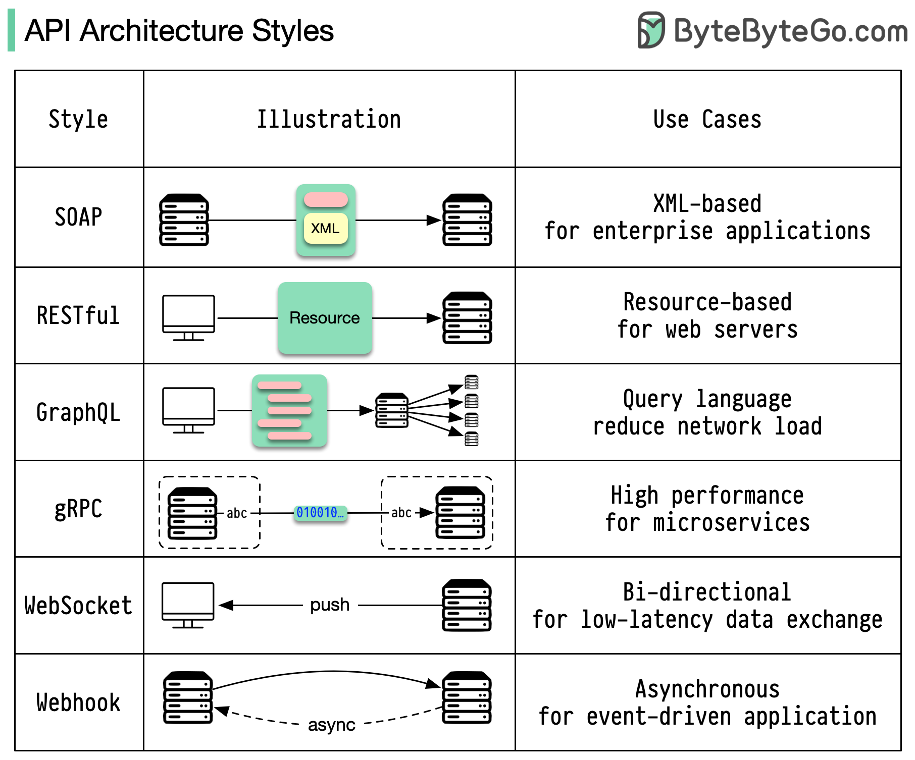 Architecture styles define how different components of an application programming interface (API) interact with one another. As a result, they ensure efficiency, reliability, and ease of integration with other systems by providing a standard approach to designing and building APIs. Here are the most used styles: