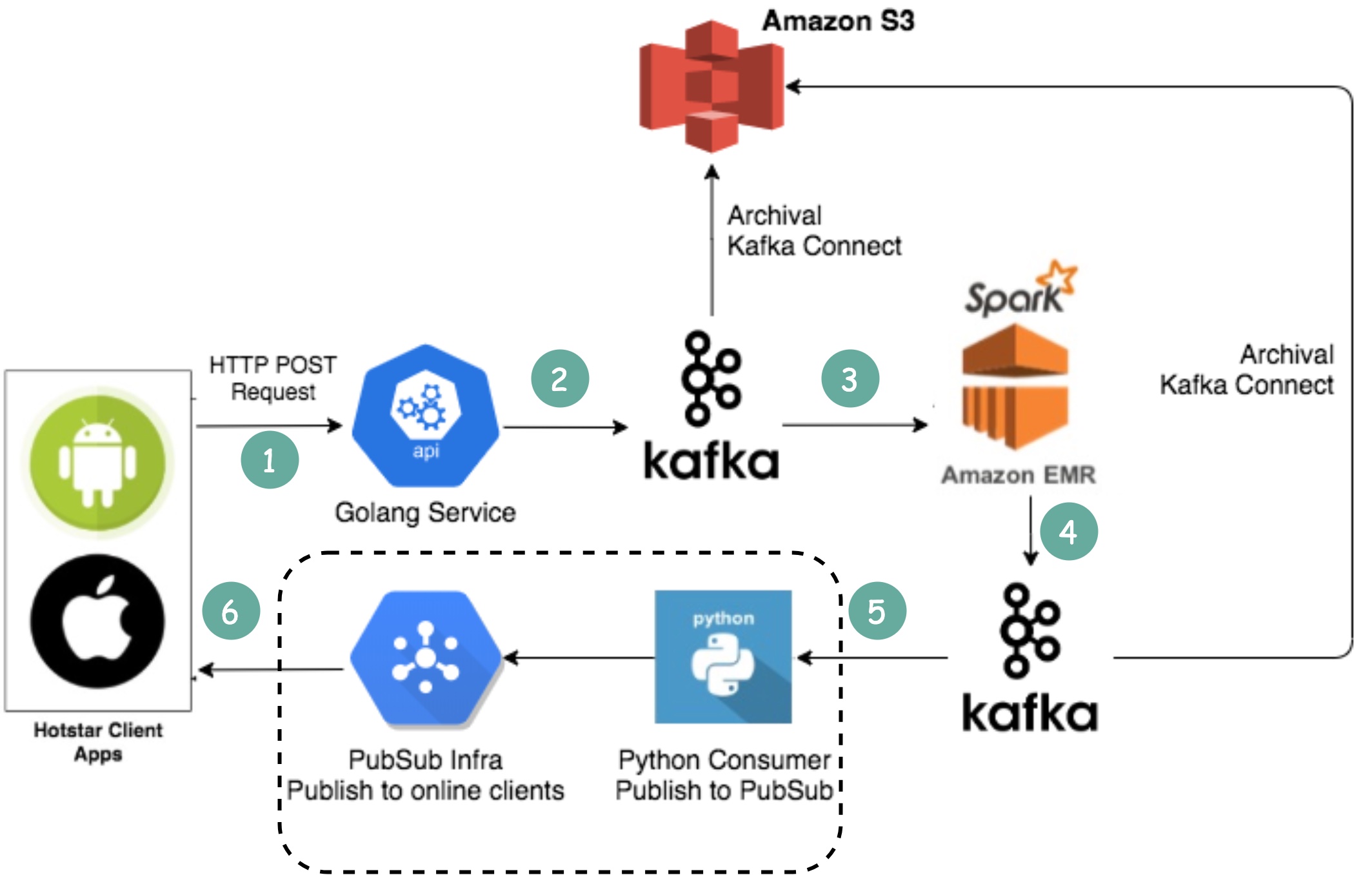 - Emojis are delivered to other clients in real-time through the PubSub infrastructure. The PubSub infrastructure is interesting. Hotstar considered the following protocols: Socketio, NATS, MQTT, and gRPC, and settled with MQTT.