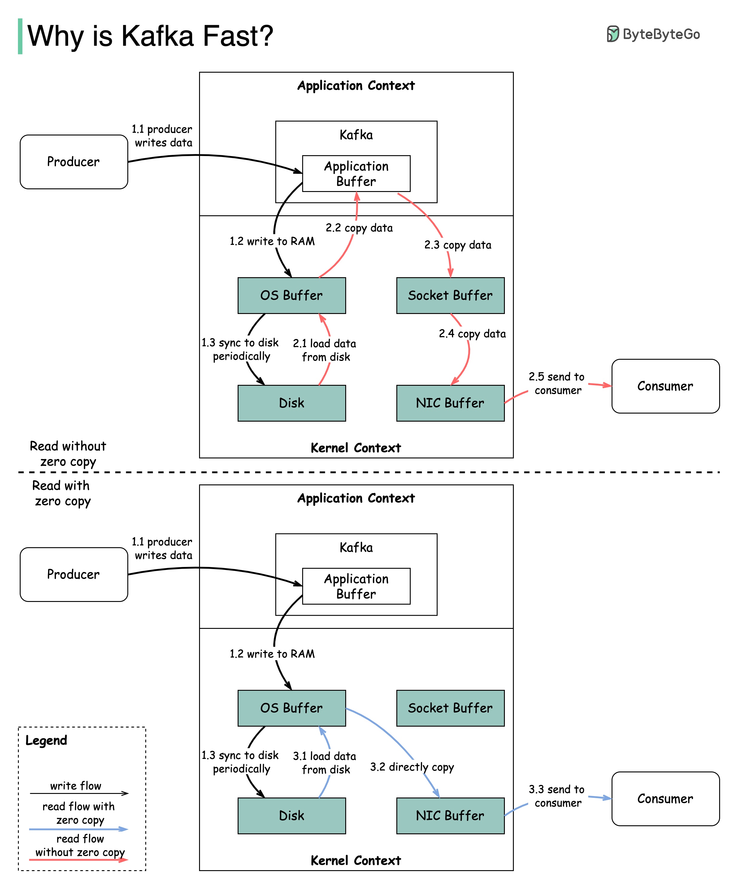- Since the write volume is very high, Kafka (message queue) is used as a buffer.