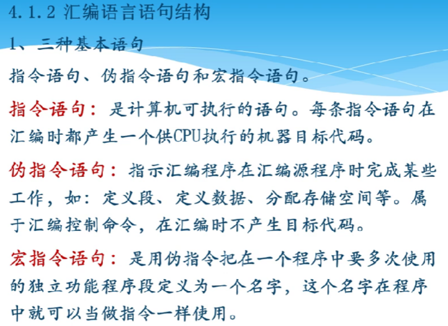 - 定义: 汇编语言是一种低级编程语言,使用助记符(mnemonics)来代替机器语言中的二进制指令。每个助记符对应一个特定的机器语言指令。