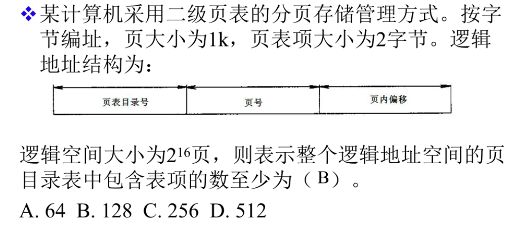 - 逻辑地址空间大小为 (2^16) 页,每个页目录项对应一页表,因此至少需要 (2^16 / 2^9 = 2^7) 个页目录项。